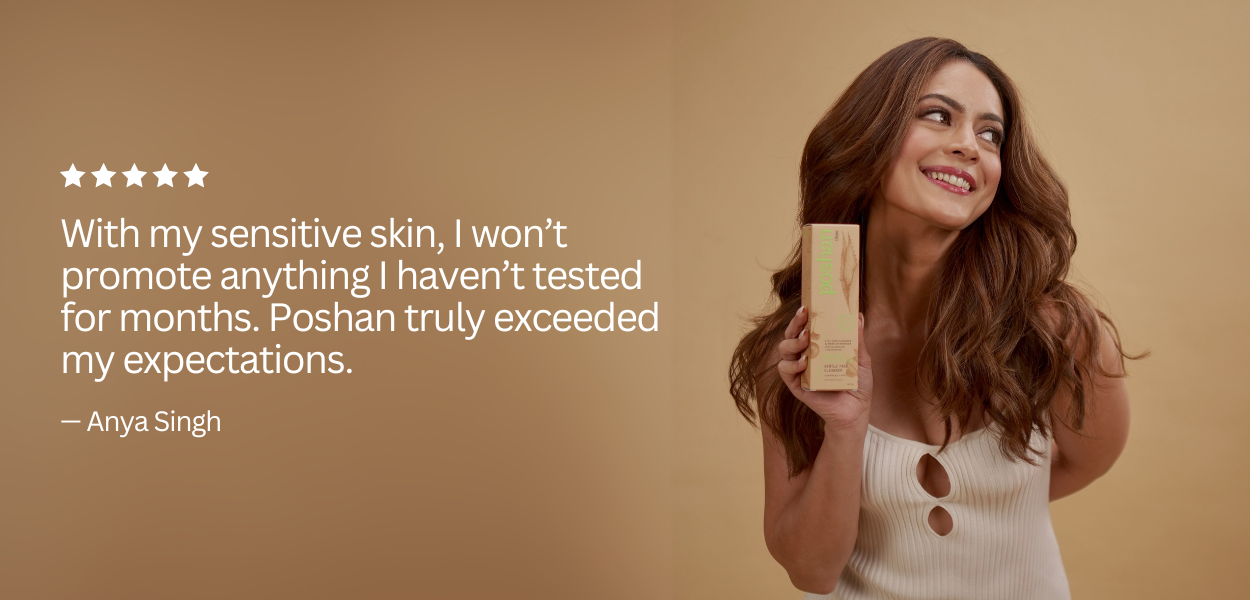beauty with authenticity and confidence. She is refreshingly real, relatable, and deeply genuine. With sensitive skin that endures heavy makeup, harsh lights, and late schedules, Anya understands what true care means. That’s why she swears by her Poshan trio — Befikar Begum, Jal Paree, and Aankhon Ka Taara — to keep her skin healthy, glowing, and resilient every day, which is why you can trust it to to keep your skin feeling it's best.